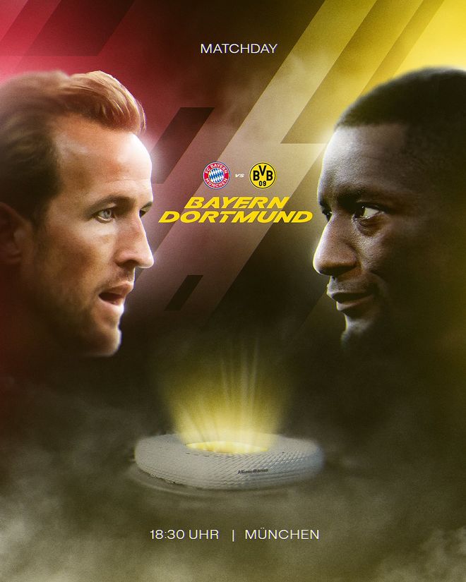 此外,拜仁慕尼黑官方同樣為本場比賽準備了預熱海報,整體更偏向漫畫風格,在高亮顯示的于帕、凱恩與阿德耶米身后,還包含許多個德國國家德比歷史上的經典場景。