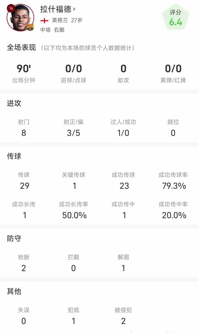 拉什福德數據:8次射門未能進球,29次傳球23次準確