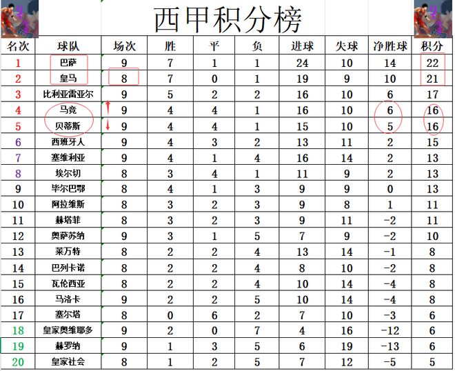 積分榜方面,最后壓哨絕殺贏球后,先賽的巴薩暫時(shí)以1分優(yōu)勢(shì)超過(guò)皇馬奪回榜首,皇馬跌到第2。馬競(jìng)今天贏球后,近8輪4勝4平保持不敗,以1個(gè)凈勝球的優(yōu)勢(shì)超過(guò)貝蒂斯擠入前4,落后榜首的巴薩6分。