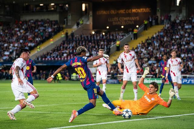 10月21日,巴塞羅那隊球員亞馬爾(左二)與奧林匹亞科斯隊門將佐拉基斯在比賽中拼搶。新華社發(胡安·戈薩攝)